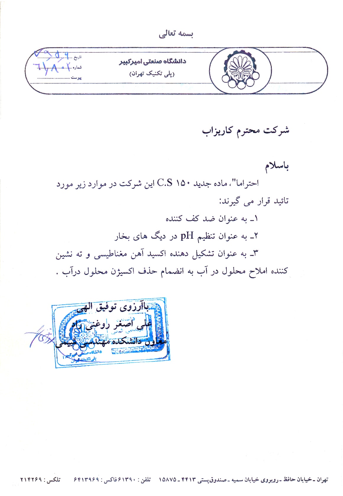 - برای مواد سی.اس.120، سی.اس140، سی.اس.150 و کیتهای اکسیژن، سختی کل، فسفات، کلر و پی اچ دارنده تاییدیه از دانشگاههای امیر کبیر و علم و صنعت